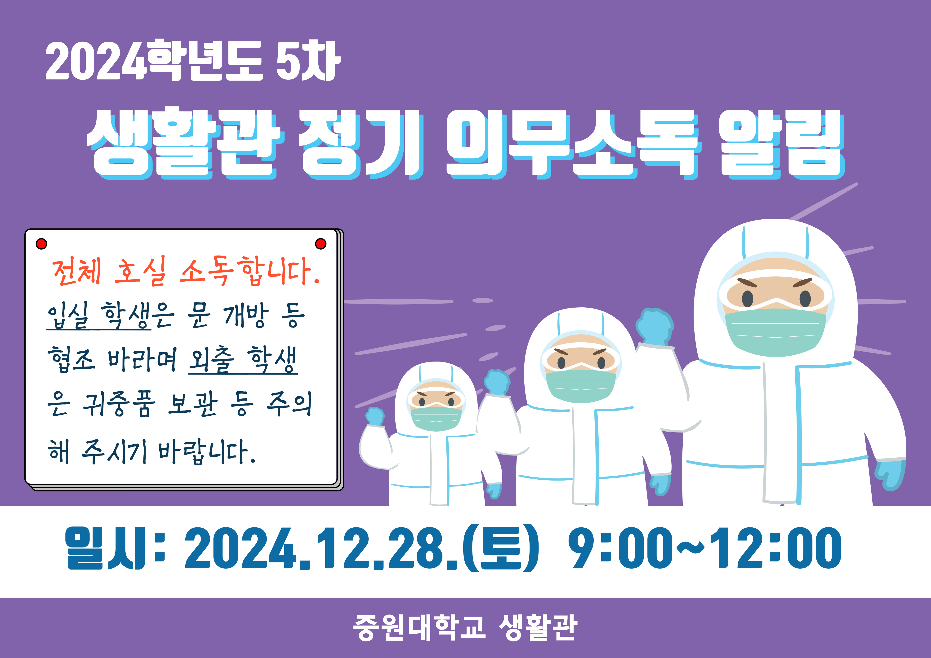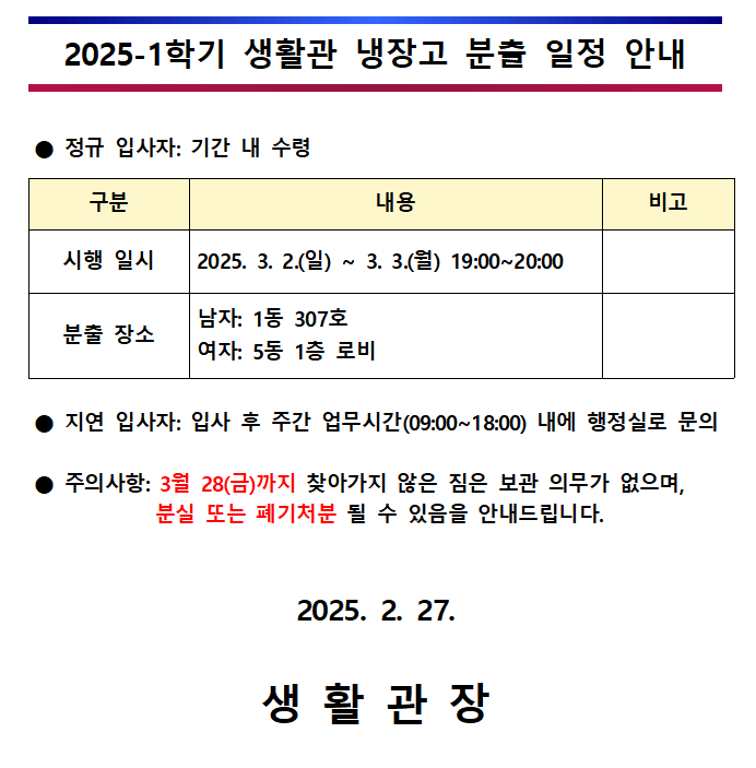 | 10 | 2025-2학기 생활관 호실변경 및 업그레이드 시행 안내 | 생활관관리자 | 2025-09-29 |